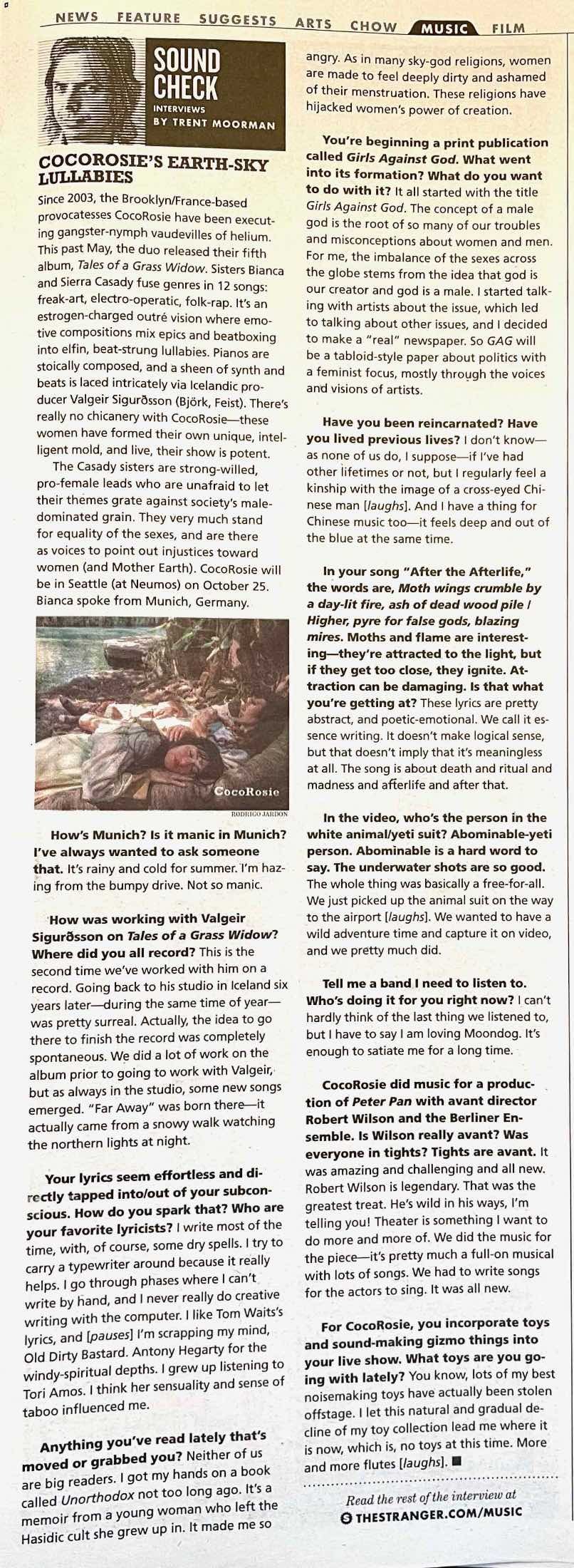CocoRosie did music for a production of Peter Pan with avant director Robert Wilson and the Berliner Ensemble. How was that? Is Wilson really avant? Was everyone in tights? Tights are avant.