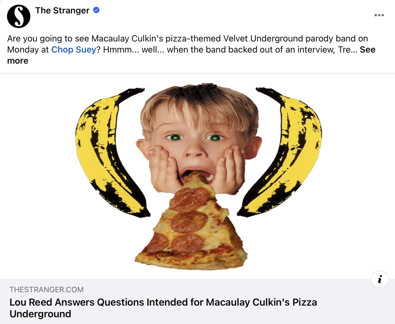 Home Alone's former child star Macaulay Culkin and his Velvet Underground parody band, the Pizza Underground, were going to do an interview, but they saw the questions I prepared and "unfortunately" became "unavailable." So I took the same questions and gave them to Lou Reed instead. Lou is a warehouse officer and night stocker for the QFC in Lake City. He doesn't really know the other Lou Reed's music that well, and he was not aware that the 33-year-old Culkin had started a meta-novelty meme band singing versions of Velvet Undergound songs about pizza. I explained to him that the Pizza Underground hand out pizzas at shows, and the songs are stonerish sing-along medleys. Recently, they released an EP on Daytrotter. Culkin plays a kazoo, someone hits a pizza box for percussion, and there is guitar and glockenspiel.