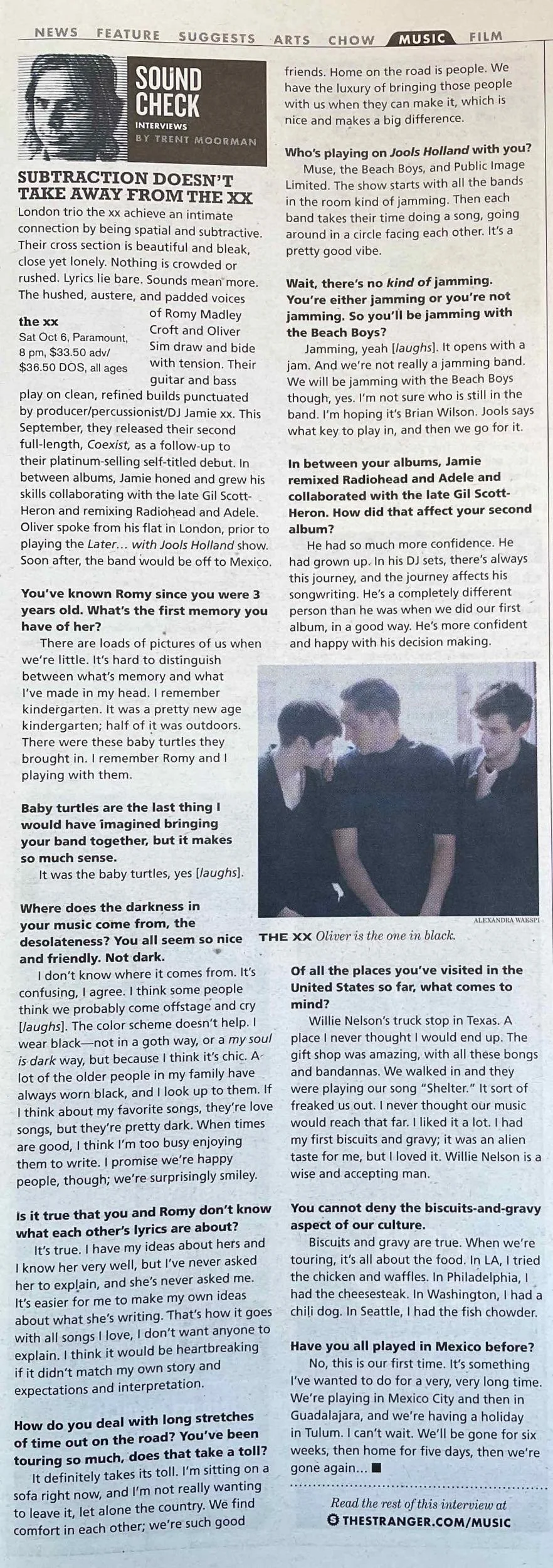 London trio the xx achieve an intimate connection by being spatial and subtractive. Their cross section is beautiful and bleak, close yet lonely. Nothing is crowded or rushed. Lyrics lie bare. Sounds mean more. The hushed, austere, and padded voices of Romy Madley Croft and Oliver Sim draw and bide with tension. Their guitar and bass play on clean, refined builds punctuated by producer/percussionist/DJ Jamie xx. This September, they released their second full-length, Coexist, as a follow-up to their platinum-selling self-titled debut. In between albums, Jamie honed and grew his skills collaborating with the late Gil Scott-Heron and remixing Radiohead and Adele.