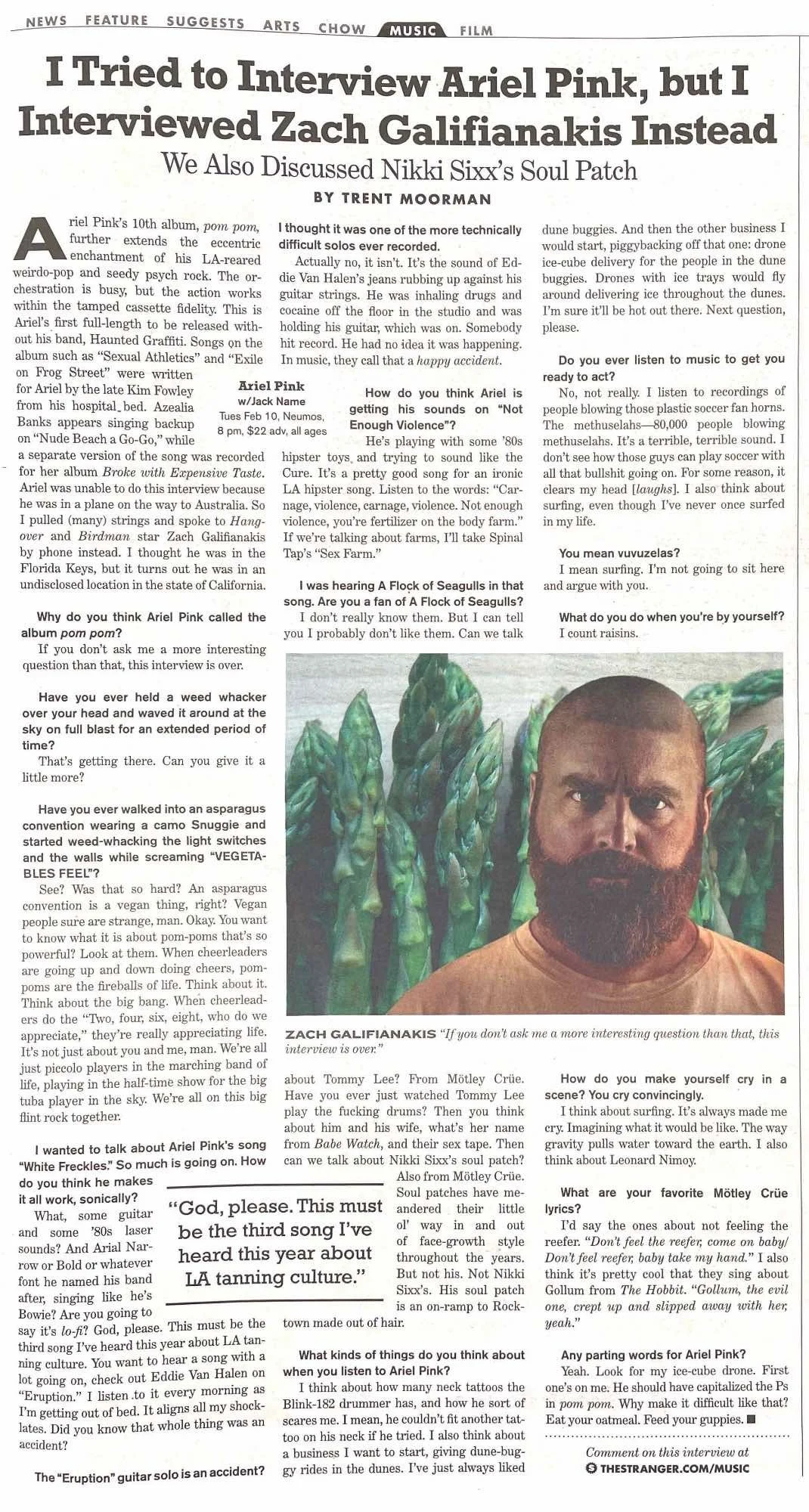Ariel was unable to do this interview because he was in a plane on the way to Australia. So I pulled (many) strings and spoke to Hangover and Birdman star Zach Galifianakis by phone instead. I thought he was in the Florida Keys, but it turns out he was in an undisclosed location in the state of California.